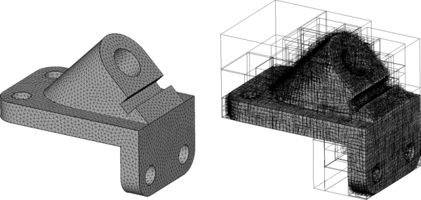 fig__aabbtree_meca Left: surface triangle mesh of a mechanical part. Right: AABB tree constructed.