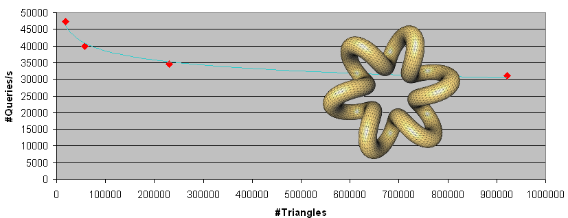 fig__figAABB-tree-bench Number of queries per second against number of triangles for the knot model with 14K (shown), 57K, 230K and 921K triangles. We call the all_intersections() function with segment queries randomly chosen within the bounding box.