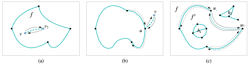 fig__arr_figex_1 The various specialized insertion procedures. The inserted \( x\)-monotone curve is drawn with a light dashed line, surrounded by two solid arrows that represent the pair of twin half-edges added to the Dcel. Existing vertices are shown as black dots while new vertices are shown as light dots. Existing half-edges that are affected by the insertion operations are drawn as dashed arrows. (a) Inserting a curve as a new hole inside the face \( f\). (b) Inserting a curve from an existing vertex \( u\) that corresponds to one of its endpoints. (c) Inserting an \( x\)-monotone curve whose endpoints are the already existing vertices \( u_1\) and \( u_2\). In our case, the new pair of half-edges close a new face \( f'\), where the hole \( h_1\), which used to belong to \( f\), now becomes an enclave in this new face.