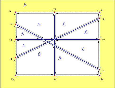 The next example shows how to use a Dcel with extended vertex, halfedge, and face records. In this example each vertex is associated with a color, which may be blue, red, or white, depending on whether the vertex is isolated, represents a segment endpoint, or whether it represents an intersection point. Each halfedge is associated with Boolean flag indicating whether its direction is the same as the direction of its associated segment (in this example segments are treated as directed objects). Each face is also extended to store the size of its outer boundary.
