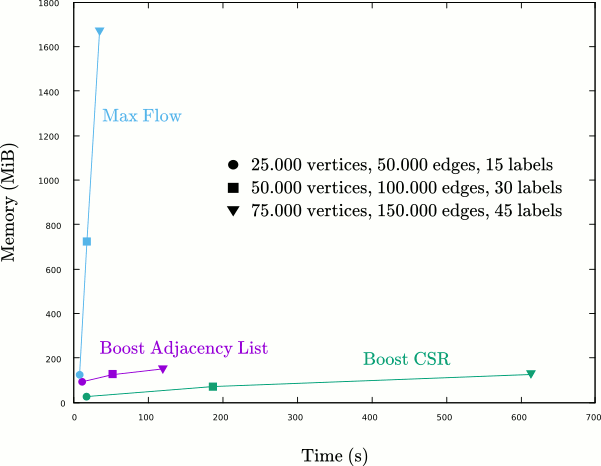 CGAL::Alpha_expansion_boost_adjacency_list_tag (default)CGAL::Alpha_expansion_boost_compressed_sparse_raw_tagCGAL::Alpha_expansion_MaxFlow_tag, released under GPL license and provided by the Triangulated Surface Mesh Segmentation Reference packageAll these implementations produce the exact same result but behave differently in terms of timing and memory (see fig__alpha_exp). The MaxFlow implementation is the fastest, but it grows rapidly in memory when increasing the complexity of the input graph and labeling; the compressed sparse raw (CSR) is very efficient from a memory point of view but becomes very slow as the complexity of the input graph and labeling increases; the adjacency list version provides a good compromise and is therefore the default implementation.
