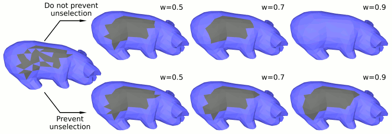 fig__regularization_fig Regularization of the borders of a face selection using alpha expansion. Different outputs are shown for different weight parameters, with and without preventing unselection.