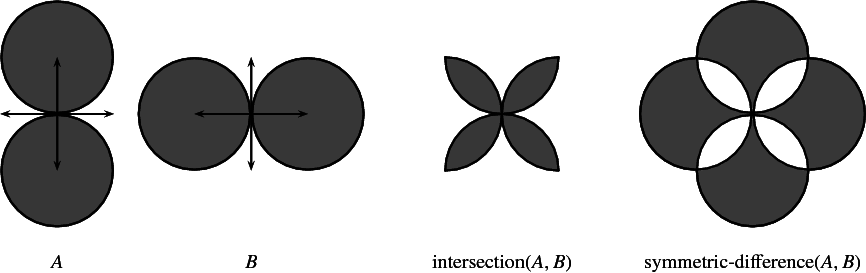 This package consists of the implementation of Boolean set-operations on point sets bounded by weakly \( x\)-monotone curvesA continuous planar curve \( C\) is weakly \( x\)-monotone if every vertical line intersects it at most once, or if it is vertical. Hereafter we refer to weakly \( x\)-monotone curves as \( x\)-monotone curves. in 2-dimensional Euclidean space. In particular, it contains the implementation of regularized Boolean set-operations, intersection predicates, and point containment predicates. fig__figteaser shows simple examples of such operations.
