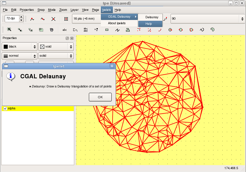 The following example shows how the class Ipelet_base can be used to easily interface the CGAL 2D Delaunay triangulation with Ipe.