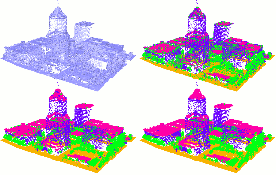 fig__Classification_image Top-Left: input point set. Top-Right: raw output classification represented by a set of colors (ground is orange, facades are blue, roofs are pink and vegetation is green). Bottom-Left: output classification using local smoothing. Bottom-Right: output classification using graphcut.
