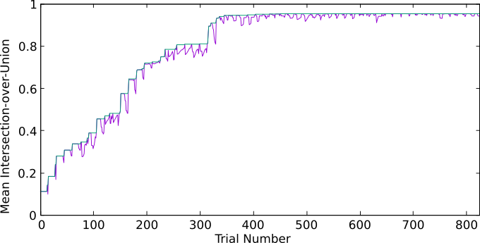 fig__Classification_trainer_fig Example of evolution of the mean intersection-over-union. The purple curve is the score computed at the current iteration, green curve is the best score found so far.