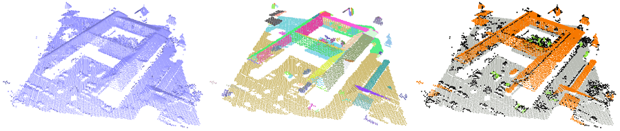 fig__Classification_cluster_fig Example of cluster classification mesh (left: input, middle: clusters computed from region growing, right: output). Ground is grey, roofs are orange, vegetation is green, points not assigned to a cluster are black.