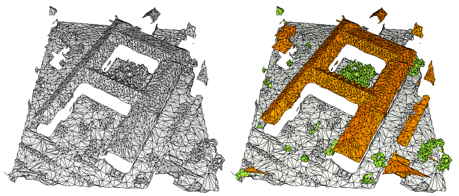 fig__Classification_mesh_fig Example of mesh classification (left: input, right: output). Ground is grey, roofs are orange, vegetation is green.