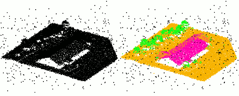 fig__Classification_sowf_result_fig Example of classification on a point set with medium noise and outliers (left: input, right: output). Ground is orange, roofs are pink, vegetation is green. Outliers are classified with an additional label outlier in black.