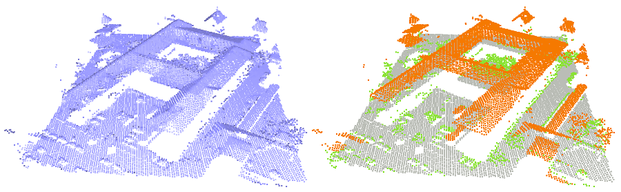 fig__Classification_point_set_fig Example of point set classification (left: input, right: output). Ground is grey, roofs are orange, vegetation is green.