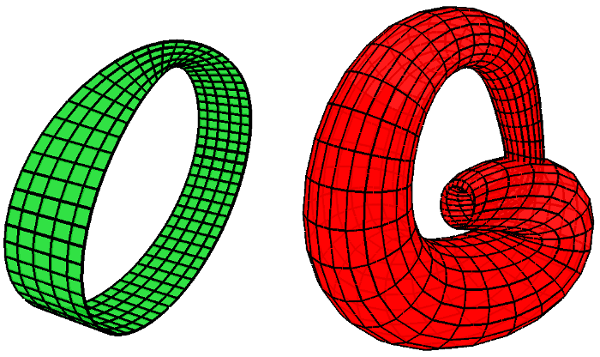 fig__fig_gmap_non_orientable_objects Example of two non-orientable objects. Left: A Möbius strip. Right: A Klein bottle.