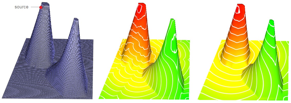 The following example shows the heat method on a triangle mesh without using the intrinsic Delaunay triangulation (iDT) algorithm, for example because by construction your meshes have a good quality (Poor quality in this case means that the input is far from Delaunay, though even in this case one may still get good results without iDT, depending on the specific geometry of the surface). The iDT algorithm is switched off by the template parameter Heat_method_3::Direct.