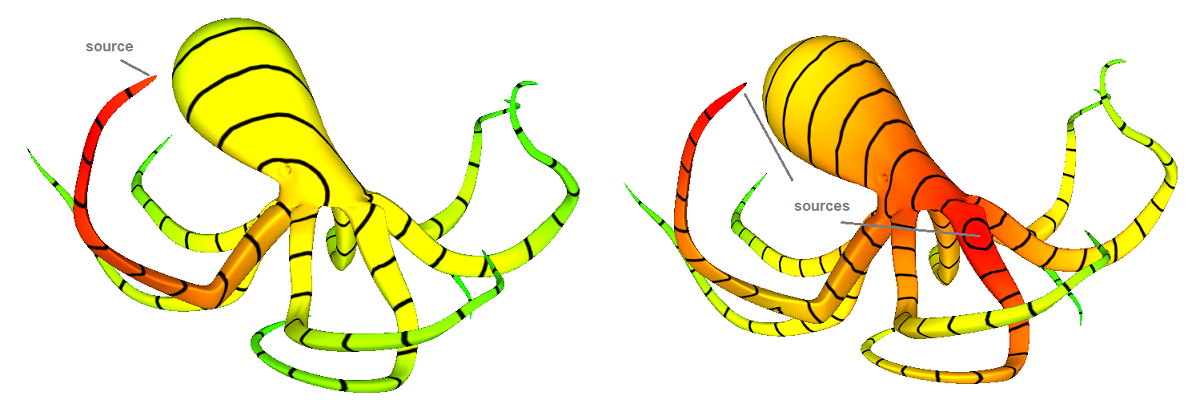 The heat method is an algorithm that solves the single- or multiple-source shortest path problem by returning an approximation of the geodesic distance for all vertices of a triangle mesh to the closest vertex in a given set of source vertices. The geodesic distance between two vertices of a mesh is the distance when walking on the surface, potentially through the interior of faces. Two vertices that are close in 3D space may be far away on the surface, for example on neighboring arms of the octopus. In the figures we color code the distance as a gradient red/green corresponding to close/far from the source vertices.