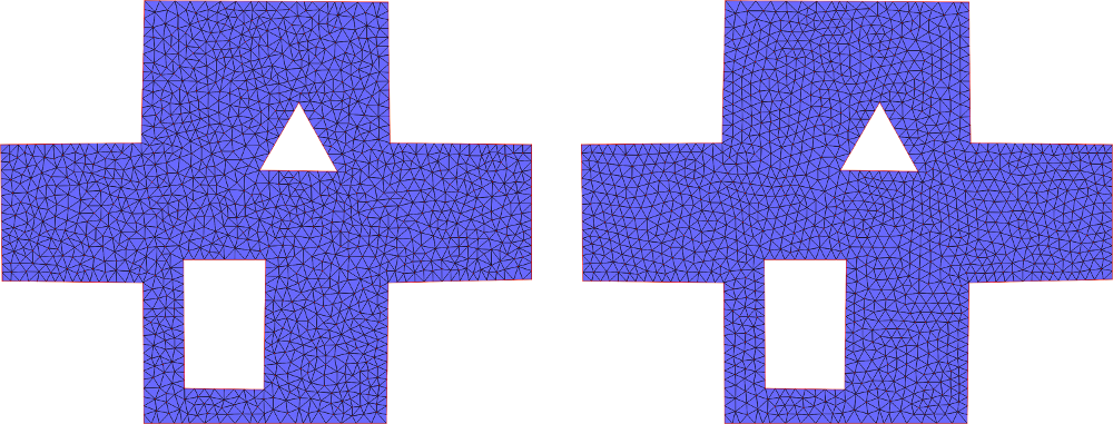 The package also provides a global function that runs Lloyd optimization iterations on the mesh generated by Delaunay refinement. The goal of this mesh optimization is to improve the angles inside the mesh, and make them as close as possible to 60 degrees.