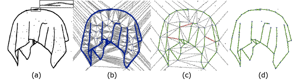 fig__Optimal_Transportation_Curve_Reconstruction_algorithm (a) Input points. (b) Delaunay triangulation of the input points. (c) After simplification, with ghost edges in grey, relevant edges in green, and irrelevant edges in red. (d) Final reconstruction made up of several edges and one isolated vertex.