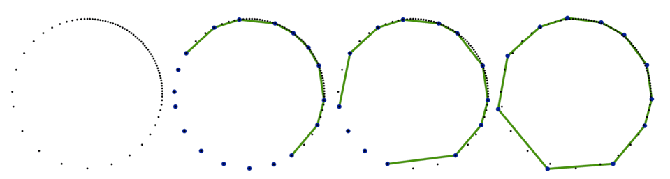 fig__Optimal_Transportation_Curve_Reconstruction_density Variable density. Left: input point set. The three other pictures show how the approximation evolves when pushing the simplification forward.