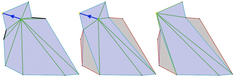 fig__Optimal_Transportation_Curve_Reconstruction_edgeflip Edge flipping. Left: the blue edge creates fold-overs because of blocking edges shown in black. Middle: after running the recursive edge flipping procedure the blue edge is collapsible. Right: triangulation after edge collapse.