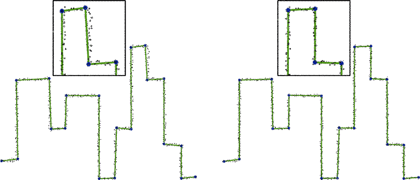 A virtue of the algorithm is its robustness to noise and outliers. fig__Optimal_Transportation_Curve_Reconstruction_robustness shows that the output of the algorithm is robust in the sense that it is hardly affected by noise and/or outliers, as long as the density of outliers is small compared to the density of the input points.