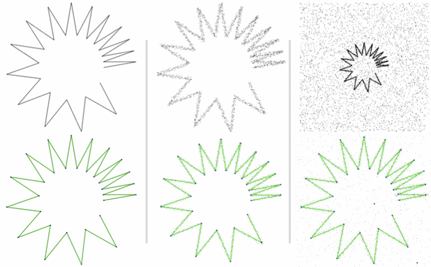 fig__Optimal_Transportation_Curve_Reconstruction_robustness Robustness to noise and outliers. Left: noise-free point set. Middle: noisy point set. Right: point set hampered by noise and outliers.