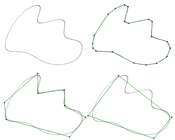 fig__Optimal_Transportation_Curve_Reconstruction_twenty_vertices Examples of 20-vertex reconstructions from datasets consisting of 2000, 400 and 200 input points respectively. These examples illustrate the behavior of the algorithm when the input point density decreases.