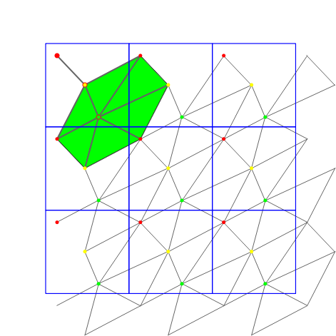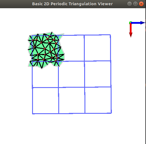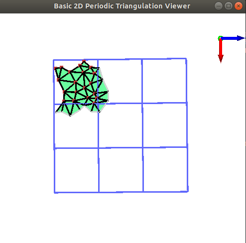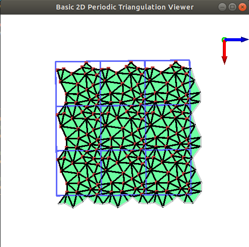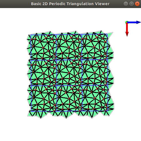 A 2D periodic triangulation can be visualized by calling the CGAL::draw<P2T2>() function as shown in the following example. This function opens a new window showing the given Periodic Triangulation. Elements of the periodic triangulation can be viewed in four different modes: