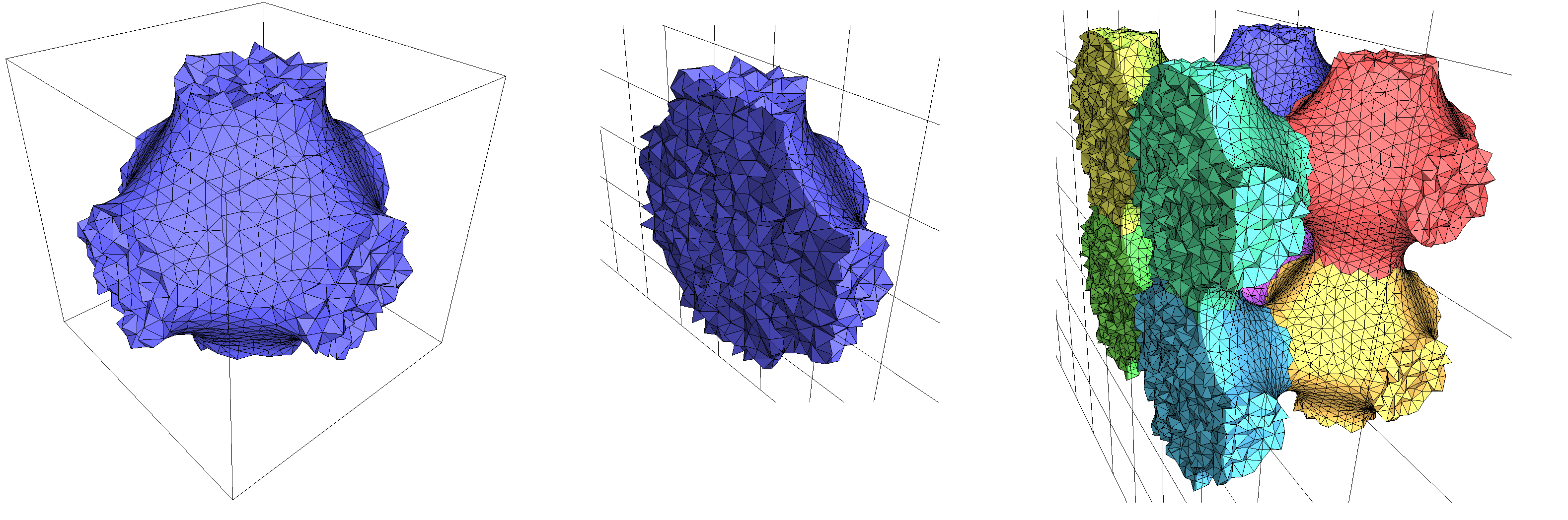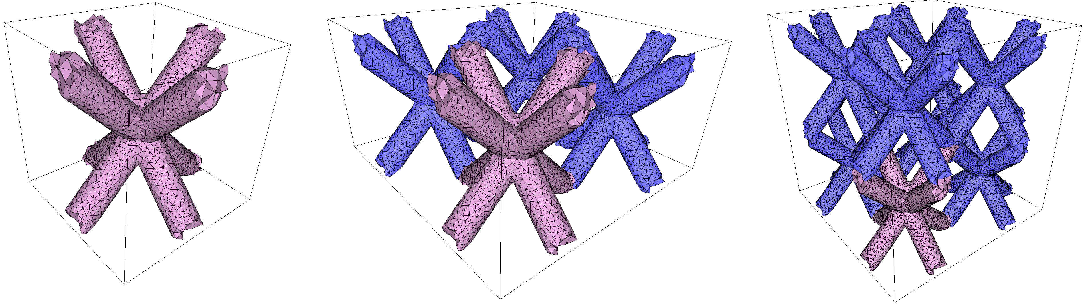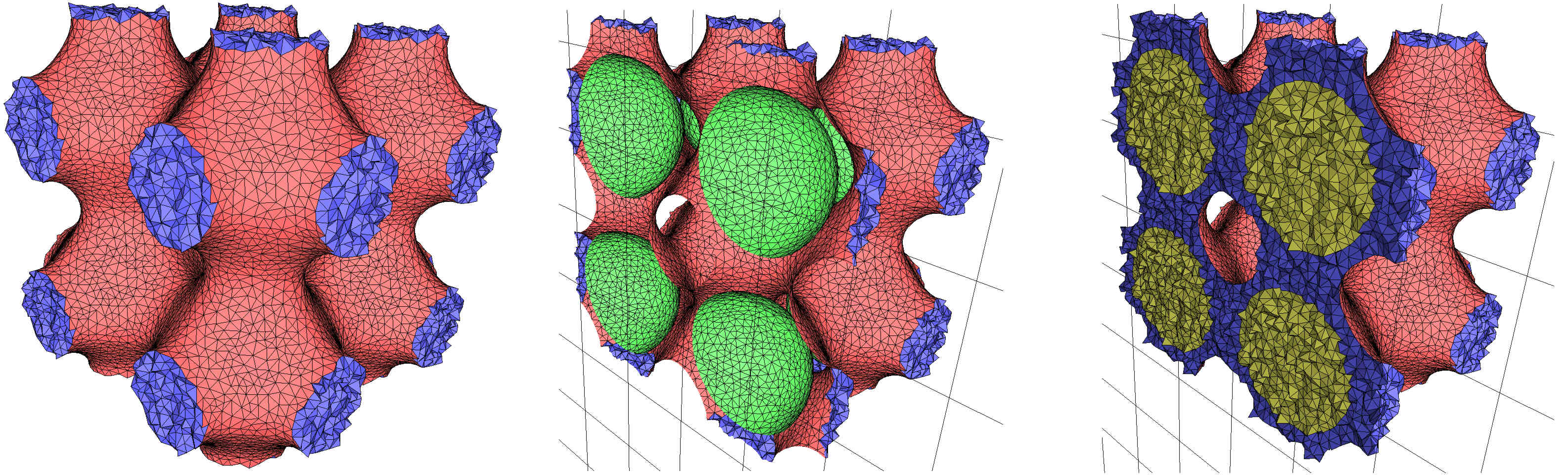 fig__Periodic_3_mesh_3Periodic_multi_domain A periodic mesh produced by a combination of implicit functions (with 8 copies, left). Cut view without (middle) and with (right) the internal tetrahedra.