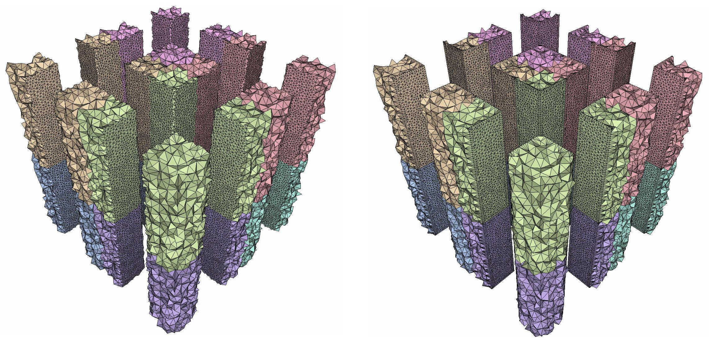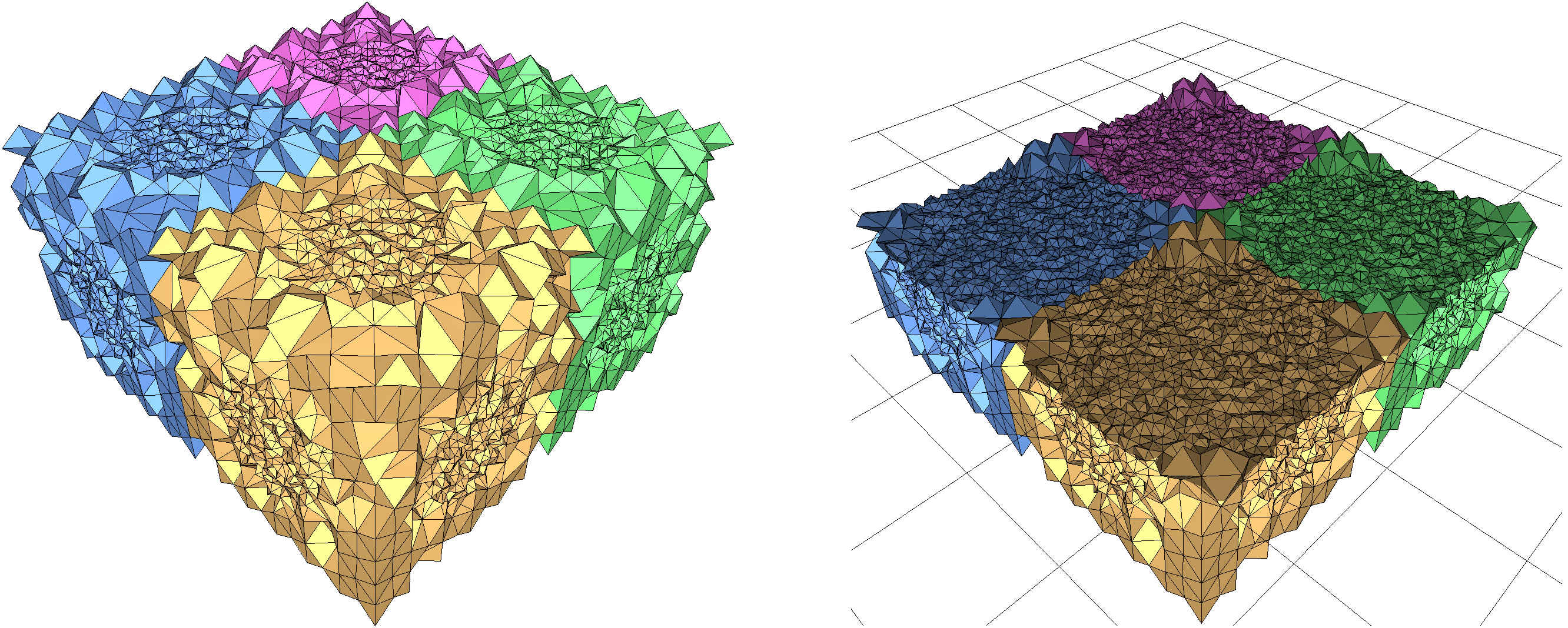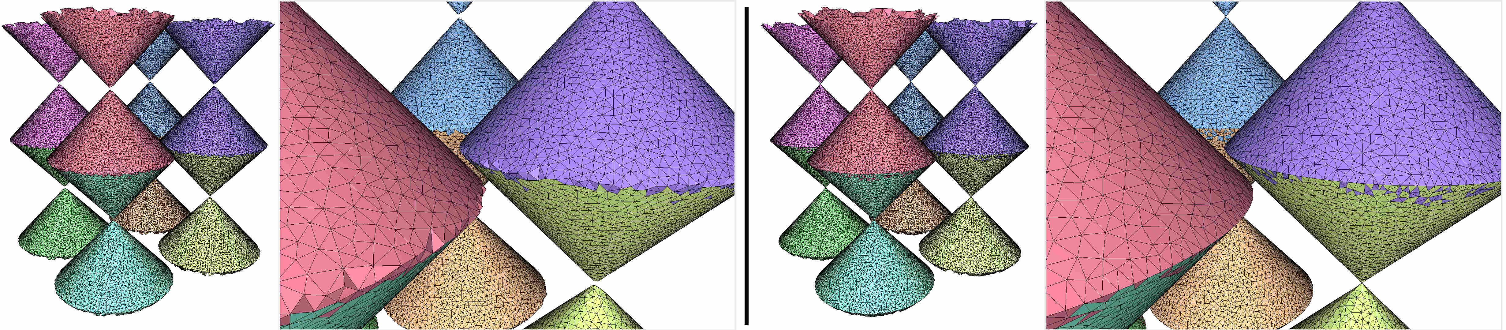 fig__Periodic_3_mesh_3Periodic_protection A periodic mesh obtained with a cone-like periodic implicit function (8 copies are drawn). The base and the apex of the cone are badly approximated when protection is unused (left). Using protection, we obtain a faithful approximation. (Facets seemingly disconnected from other facets of the same color are due to the fact that a single copy of the mesh does not necessarily form a visually pleasing mesh by itself; see Section Visualizing Multiple Copies of a Periodic Mesh for more details.)
