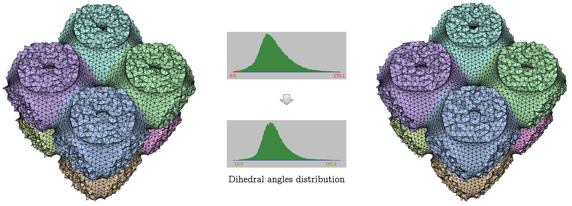 fig__Periodic_3_mesh_3Periodic_optimizers Compared effect of a mesh pre- and post-optimization using all available optimizers. The numbers under the histograms give the measure in degrees of the smallest and biggest dihedral angles in the mesh.