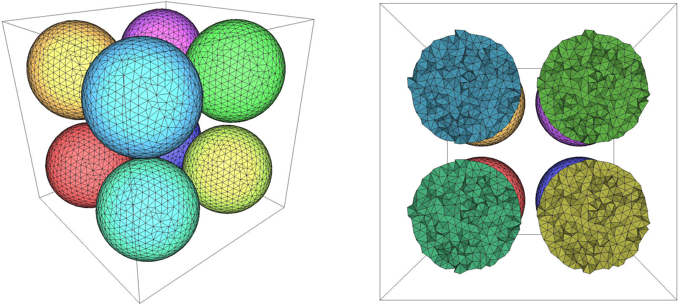 fig__Periodic_3_mesh_3Periodic_implicit_sphere Periodic mesh of an implicit sphere that is entirely contained in the input cube, shown with 8 copies (left). A cut view along one of the axes (right).
