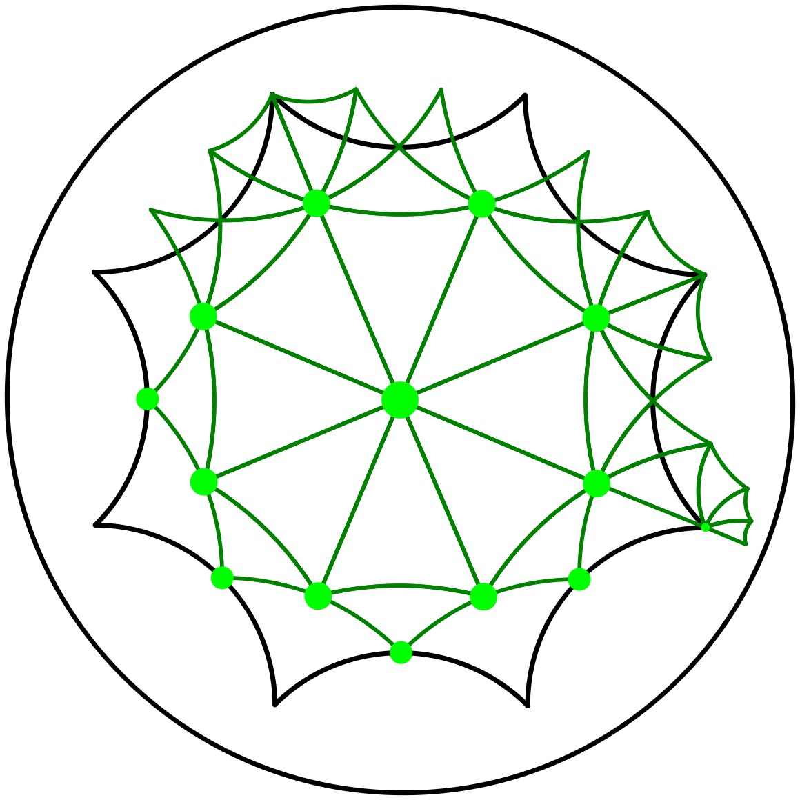 fig__P4HTriangulationDummyPoints Delaunay triangulation of \(\mathcal M\) defined by the 14 dummy points. The set \(\mathcal Q\) of dummy points contains the origin, the vertex of \(\mathcal D\), the midpoints of the closed sides of \(\mathcal D\), and the (hyperbolic) midpoints of the segments between the origin and the vertices of the octagon.