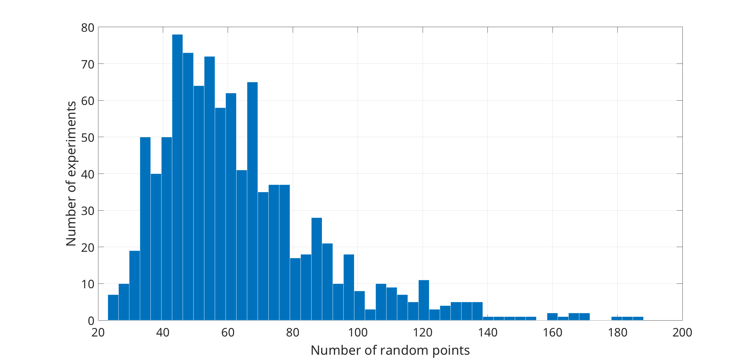 fig__P4HDummyPointsHistogram Histogram of the number of random input points needed to remove all dummy points in a triangulation of the Bolza surface. The histogram shows results acquired from 1000 executions of the experiment described above. In these 1000 executions, the minimum number of random points needed to remove all dummy points was 23, the maximum 188, and on average 64 random points were needed.