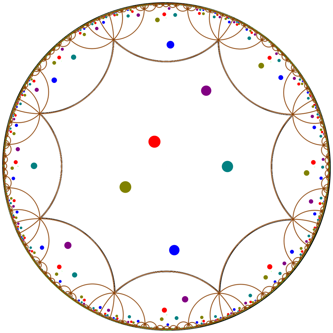 Let \(\mathbb{H}^2\) denote the hyperbolic plane, represented in the Poincaré disk model (see Chapter 2D Hyperbolic Delaunay Triangulations). The Bolza surface \(\mathcal{M}\) is defined as the quotient of \(\mathbb H^2\) under the action of a group \(\mathcal G\) that we will introduce now.