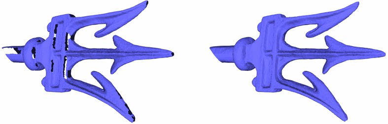 The hole filling algorithm has a complexity which depends on the number of vertices. While [9] has a running time of \( O(n^3)\) , [12] in most cases has running time of \( O(n \log n)\). We benchmarked the function triangulate_refine_and_fair_hole() for the two meshes below (as well as two more meshes with smaller holes). The machine used was a PC running Windows 10 with an Intel Core i7 CPU clocked at 2.70 GHz. The program was compiled with the Visual C++ 2013 compiler with the O2 option, which maximizes speed.