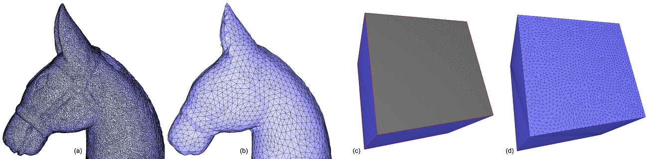 fig__iso_remeshing Isotropic remeshing. (a) Triangulated input surface mesh. (b) Surface uniformly and entirely remeshed. (c) Selection of a range of faces to be remeshed. (d) Surface mesh with the selection uniformly remeshed.