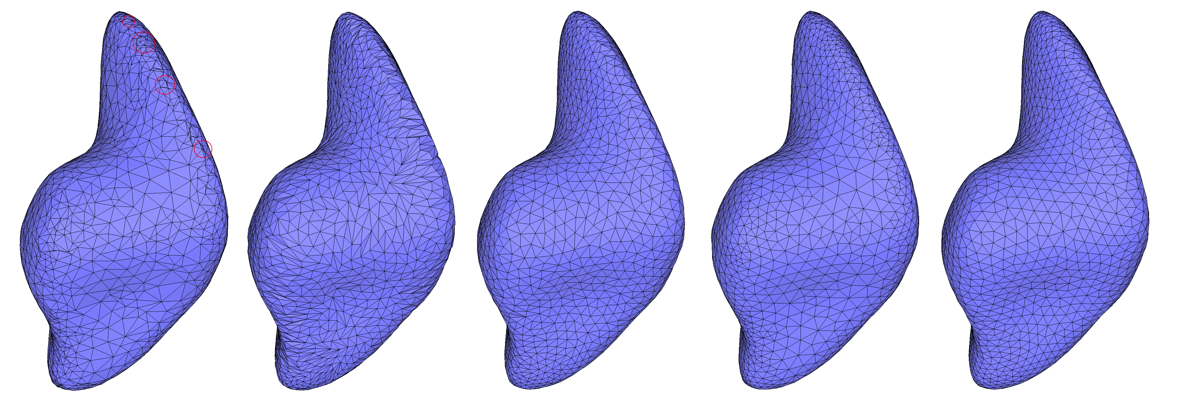 fig__PMPFigMeshSmoothing Mesh smoothing of the closed surface blobby, containing self-intersections (circled in red). For each smoothing combination, 10 iterations were applied. From left to right: (a) Input mesh; (b) Smoothing based on areas without using Delaunay flips; (c) Smoothing based on areas with Delaunay flips; (d) Smoothing based on angles; (e) Smoothing based on angles and areas, with Delaunay flips.