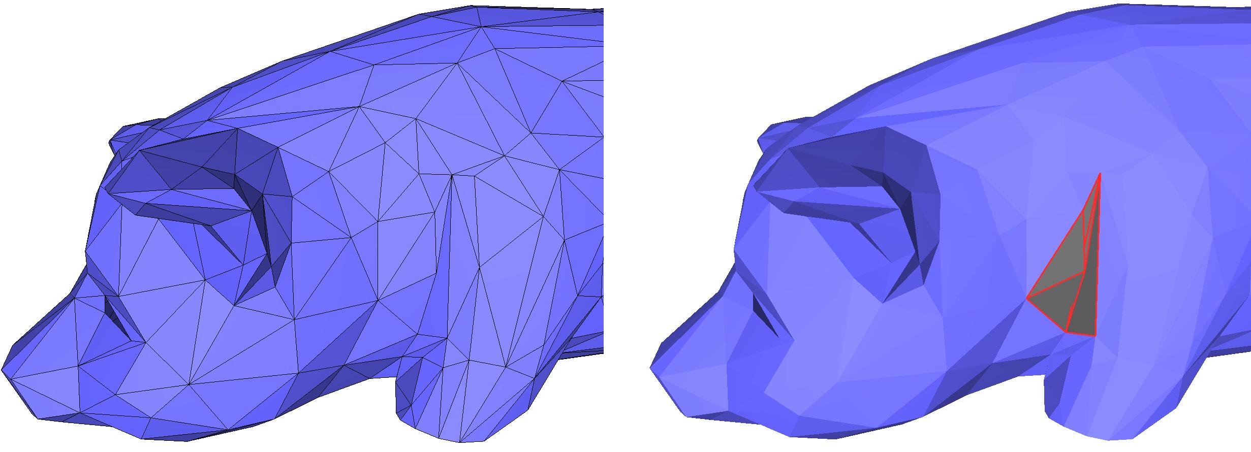 CGAL::Polygon_mesh_processing::is_degenerate_edge(), to detect if an edge is degenerate (that is, if its two vertices share the same geometric location).CGAL::Polygon_mesh_processing::is_degenerate_triangle_face(), to detect if a face is degenerate (that is, if its three vertices are collinear).CGAL::Polygon_mesh_processing::degenerate_edges(), to collect degenerate edges within a range of edges.CGAL::Polygon_mesh_processing::degenerate_faces(), to collect degenerate faces within a range of faces.CGAL::Polygon_mesh_processing::is_cap_triangle_face()CGAL::Polygon_mesh_processing::is_needle_triangle_face()To ease the manipulation of points on a surface, CGAL offers a multitude of functions based upon a different representation of a point on a polygon mesh: the point is represented as a pair of a face of the polygon mesh and a triplet of barycentric coordinates. This definition enables a robust handling of polylines between points living in the same face: for example, two 3D segments created by four points within the same face that should intersect might not actually intersect due to inexact computations. However, manipulating these same points through their barycentric coordinates can instead be done, and intersections computed in the barycentric space will not suffer from the same issues. Furthermore, this definition is only dependent on the intrinsic dimension of the surface (i.e. 2) and not on the ambient dimension within which the surface is embedded.