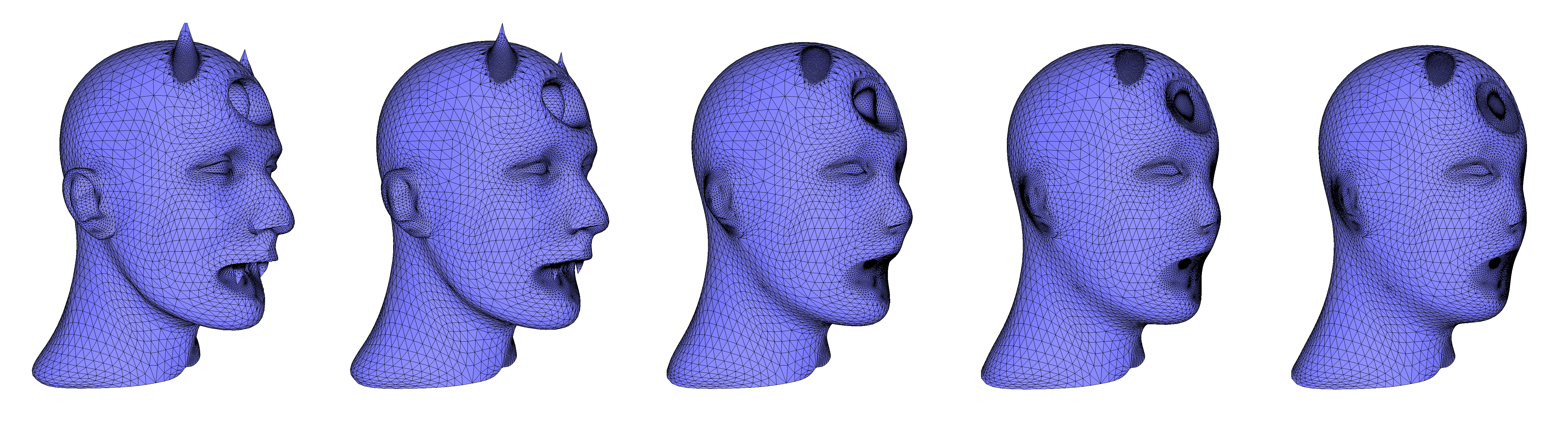fig__PMPFigShapeSmoothing Shape smoothing of the devil model, using the mean curvature flow with a time step equal to 0.05 and constraining border vertices (located at the neck, where the mesh is open).