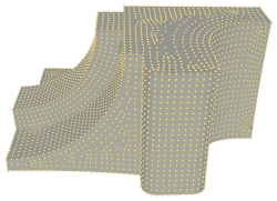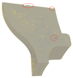 As described above, ideally the point set regularly samples the surface. For example, for each point its six nearest points lie at roughly equal distance forming a rough hexagon around the point. This will generally not occur when working with realistic data. The scale-space method can reconstruct very unevenly sampled surfaces, as fig__chapterScaleSpaceReconstruction3figUneven shows. However, as noted earlier the sampling regularity and allowed concavity form a trade-off. fig__chapterScaleSpaceReconstruction3figUnevenFail shows a case where we cannot simultaneously model the concave regions and sparse regions correctly.