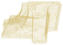 The resulting surface is stored as a collection of triples. Each triple contains three indices to the point set. The scale iterations do not change the order of the points. This means these indices can be applied on the point set at its original scale to get an interpolating surface, called reverting the scale of the surface. The indices may also be applied to the point set at the current scale to get a smoothed surface. This smoothed surface will generally have shrunk somewhat compared to the reverted surface.