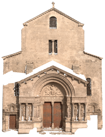 fig__chapterScaleSpaceReconstruction3figColor Left: A reconstructed surface with vertex coloring using the colors of the point set. Right: detail of the surface shown as wire-frame. Images or image-based modeling: MAP (Modèles et simulations pour l'Architecture et le Patrimoine) - UMR CNRS/MCC 3495.