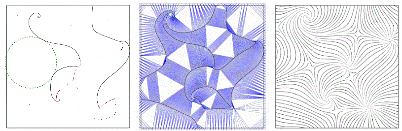 fig__illustration The core idea of the algorithm is to integrate the streamlines from the center of the biggest empty cavities in the domain (left). A Delaunay triangulation of all the sample points is used to model the streamlines and the spaces within the domain (middle). A final result is shown (right).
