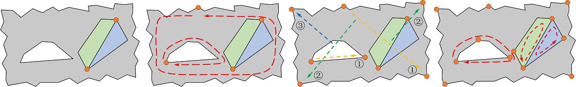 fig__anchors Adding anchors. From left to right: starting from a partition (grey) with a hole (while) and two encircled regions (green and blue), we add a starting anchor (orange disk) to the boundary cycle (red dash line) without any anchor (2nd), subdivide the circular chord (3rd, the number indicates the level of recursion) and add anchors to the boundary cycle with less than 2 anchors (4th, red dash lines).