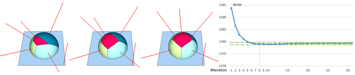 fig__iterations Discrete Lloyd iterations on the plane-sphere model with planar proxies and the \( \mathcal{L}^{2,1} \) metric: (left) random seeding of 6 proxies; (center) after one iteration; (right) after 8 iterations, the regions settle. The red lines depict the proxy normals drawn at the seed faces.