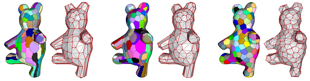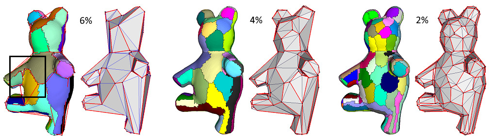 In fig__meshing, the bear model is approximated through \( \mathcal{L}^{2,1} \) metric and the final number of proxies is determined by monitoring the error drop. The anchor points (black) are attached to the corresponding vertex on the mesh (white). The red lines connecting the anchor points approximate the boundary of each region.