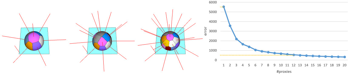 To determine when to stop adding more proxies, we can specify either the maximum number of proxies required to approximate the geometry or the minimum error drop percentage with respect to the very first partition. More specifically, we can decide: