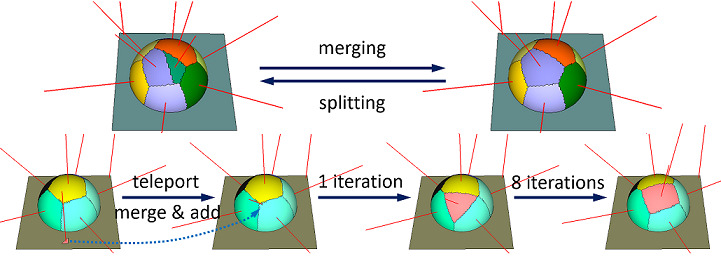 As depicted in Figure fig__operations, teleportation provides a means to relocate a local minimum region entrapped in the planar part (left) to the most needed regions on the sphere (right). In Class Interface, the class interface is used to control the approximation process through the aforementioned operations.