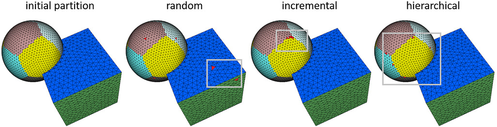 fig__seeding_method Different seeding methods on the sphere-cube model. From left to right: initial partition ( \( \mathcal{L}^{2,1} \) metrics and 20 proxies), add 5 proxy seeds (red faces) with random, incremental and hierarchical methods respectively.