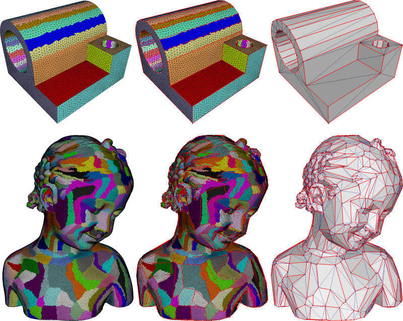 fig__Approximation_teaser Variational shape approximation on two models with the \( \mathcal{L}^{2,1} \) error metric and planar proxies. From left to right: partition of the input surface triangle mesh, anchor vertices and edges, and output triangle mesh. The partition is optimized via discrete clustering of the input triangles, so as to minimize the approximation error from the clusters to the planar proxies (not shown).