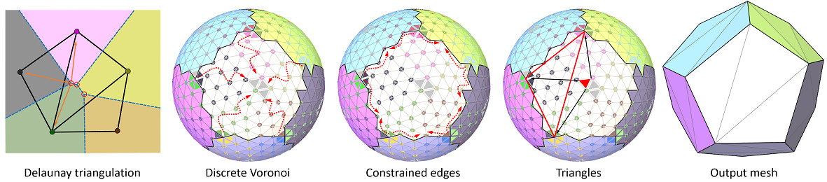 The first image of Figure fig__triangulation depicts how the Delaunay triangulation of set of points (colored disks) is deduced from its dual Voronoi diagram (colored regions separated by blue lines) by connecting the points indicated by the vertices (red circles) where 3 Voronoi cells meet. In an analogous manner, we construct discrete Voronoi cells from which the triangulation is extracted.