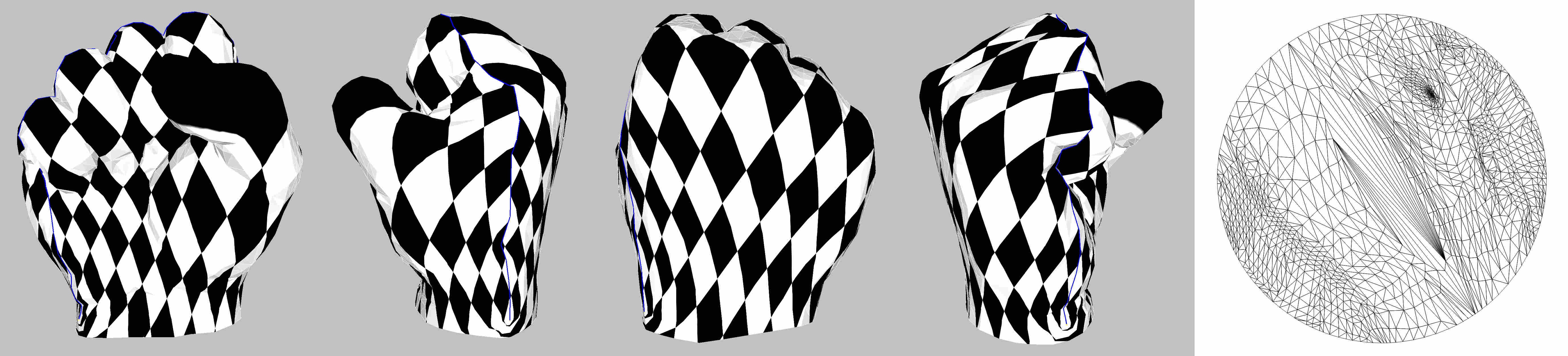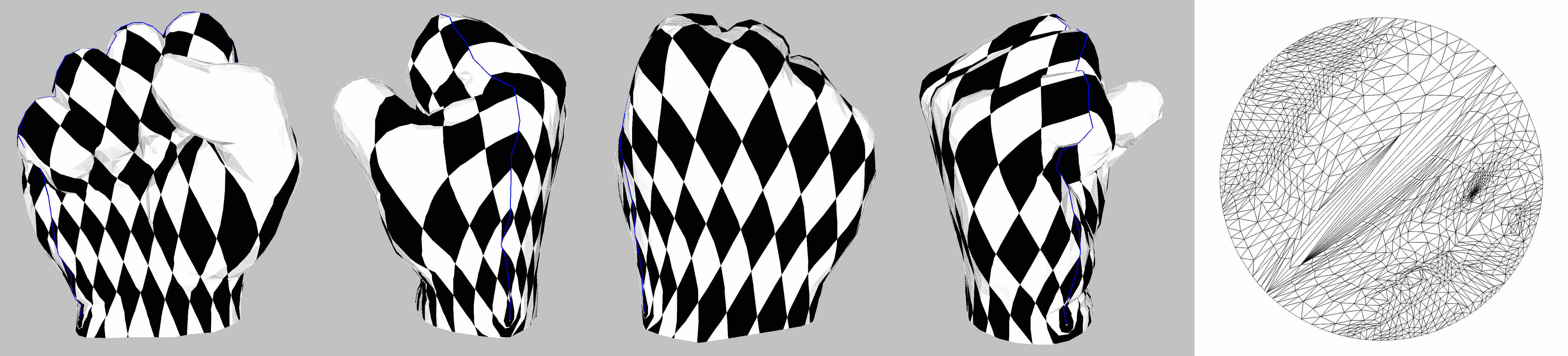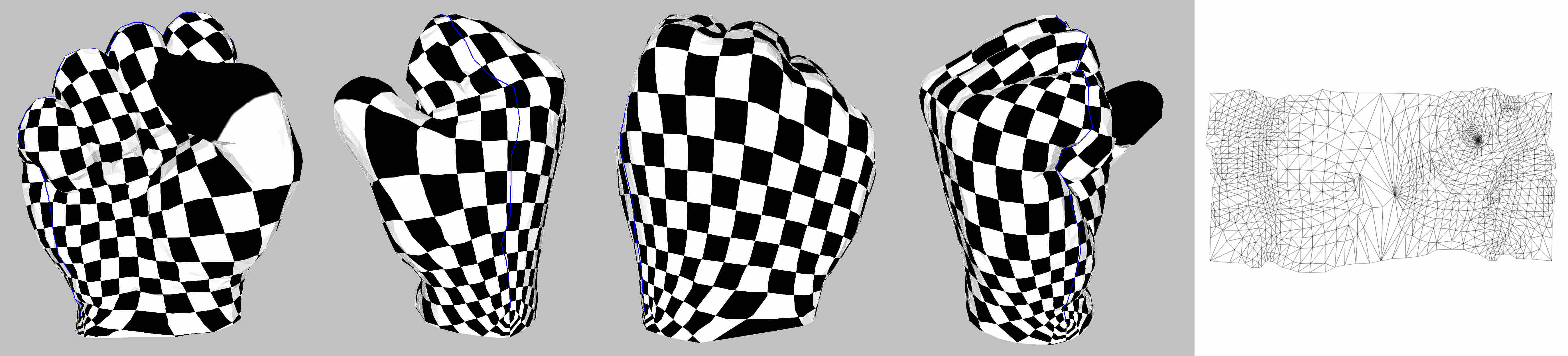 fig__Surface_mesh_parameterizationfigARAP As Rigid As Possible parameterization (the blue line depicts the cut graph). Rightmost: parameter space.